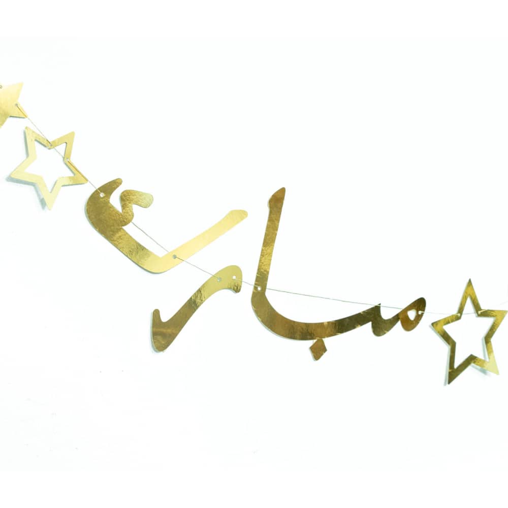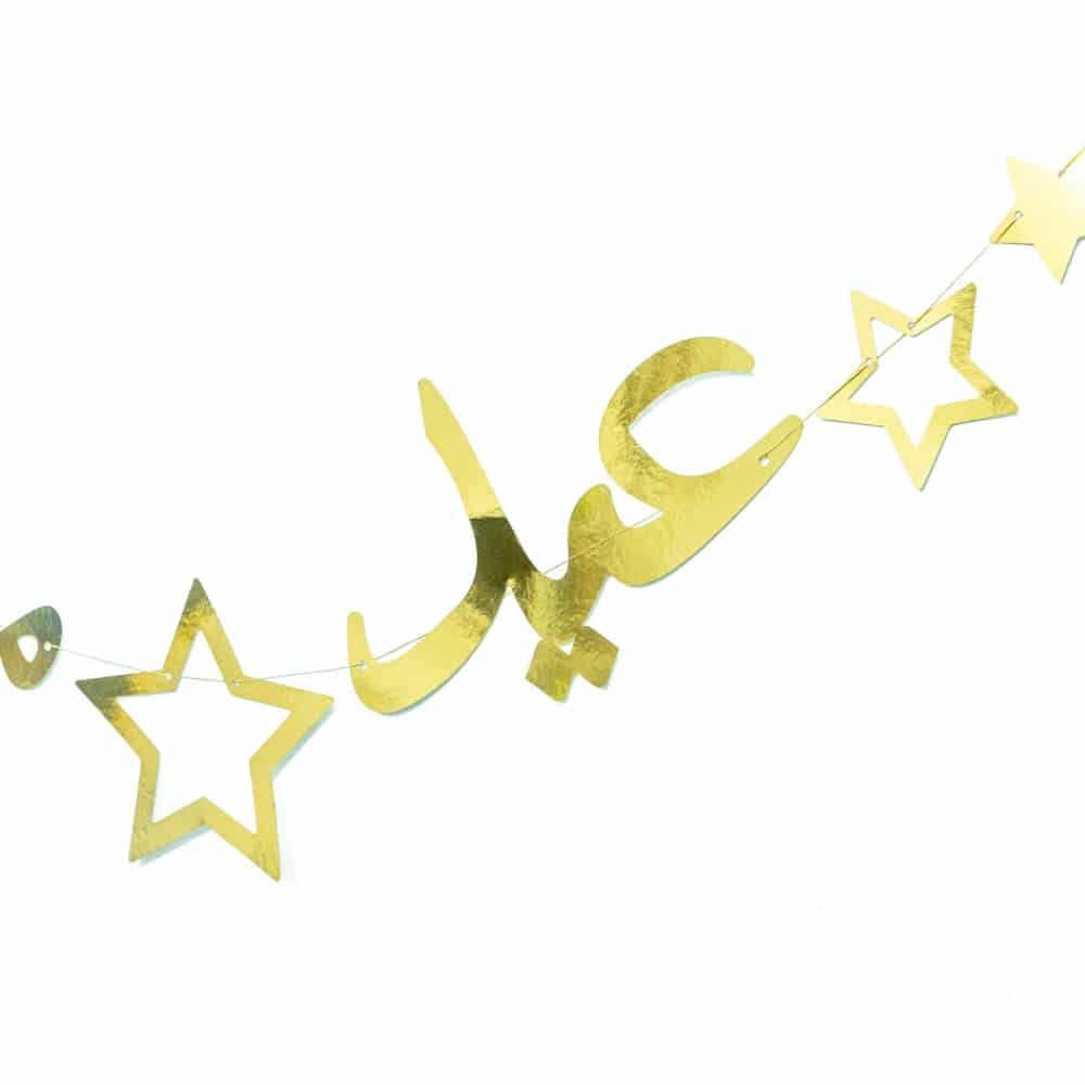 Eid Mubarak Banner: Perfect Eid Mubarak Banner print in Arabic gold words, combined with stars in golden pattern, a must-have bunting for your Eid decor.