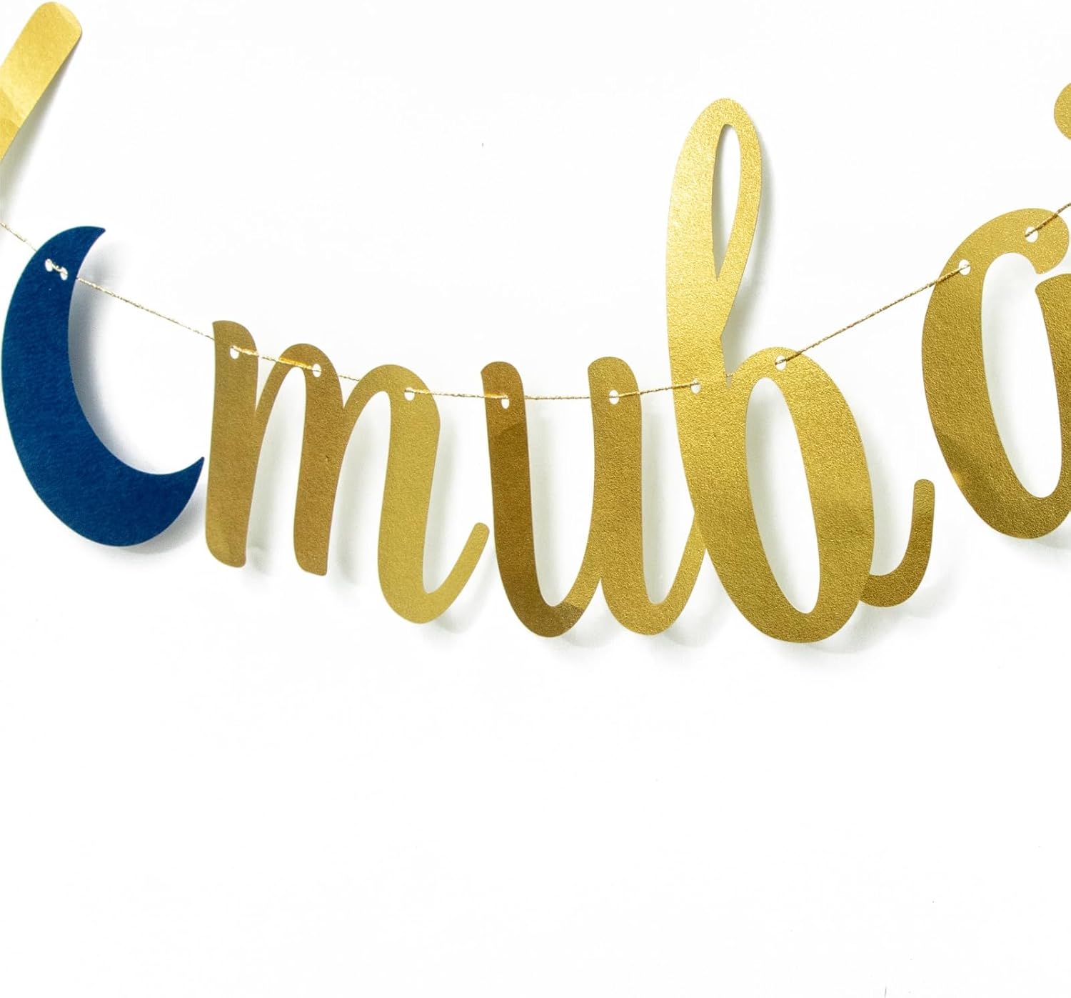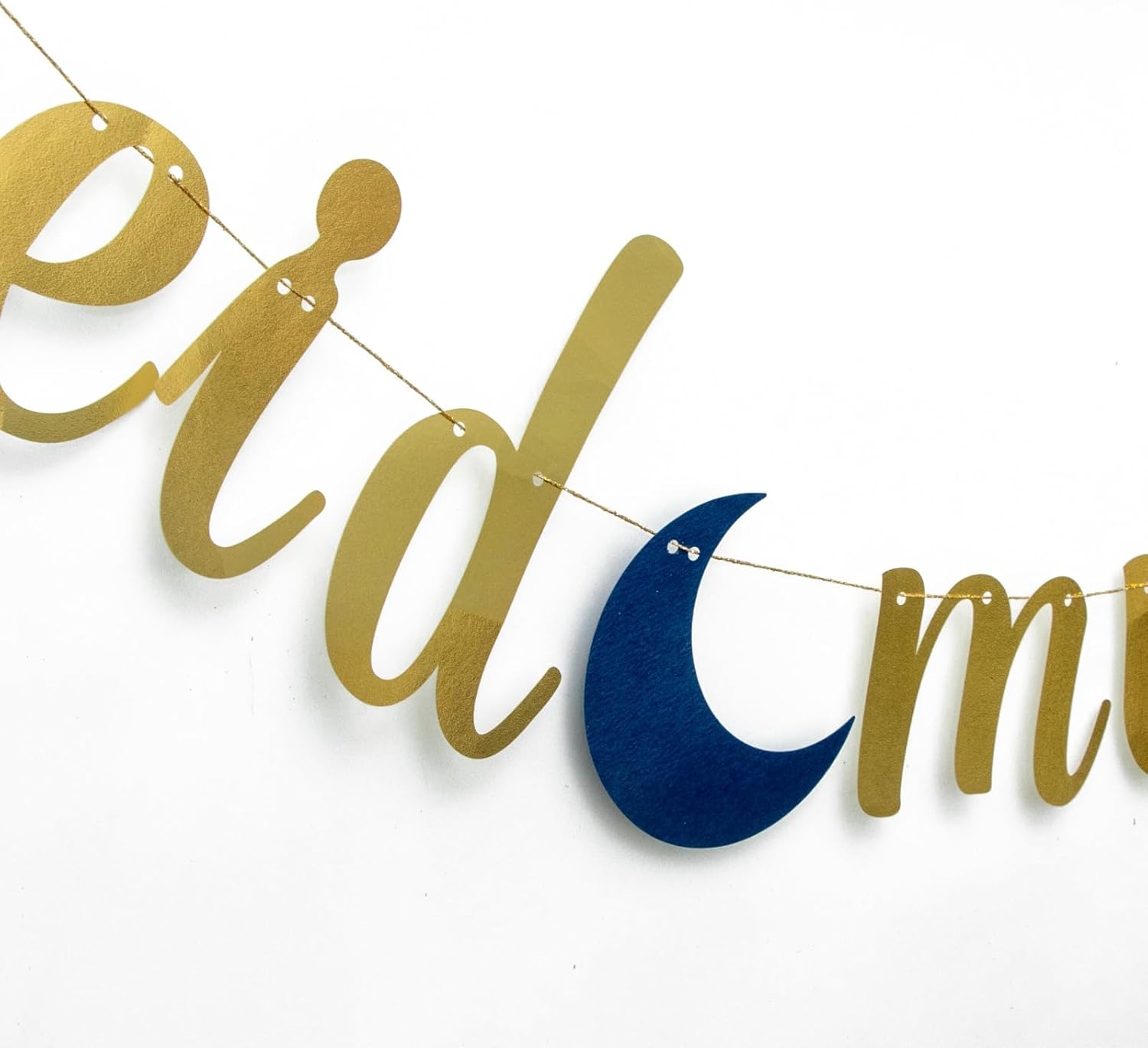 Celebrate the joyous occasion of Eid Mubarak with this stunning gold banner. Crafted with care, this garland features the words 'Eid Mubarak' beautifully scripted in metallic gold, accompanied by charming star accents. Hang it prominently in your home or venue to create a festive atmosphere and honour the spirit of Ramadan Kareem. Measuring approximately 3 metres in length, this banner is the perfect size for adorning walls, mantles, or entryways. Its lightweight design ensures effortless installation, while the durable materials ensure it can be reused year after year, making it a cherished decoration for Eid celebrations to come. Elevate your Eid decor with this elegant and eye-catching banner from thePartyPopper.