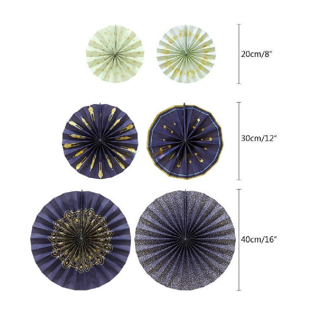 Package Included: (Warm notice: The color may exist slight differences due to different screen displays) you will receive 6 pieces of eid paper fans for Ramadan Kareem decorations, available in 3 sizes, the rich design and sizes together to create a gorgeous visual display; Add a happy Ramadan Kareem atmosphere to your Eid Al Fitr holiday home