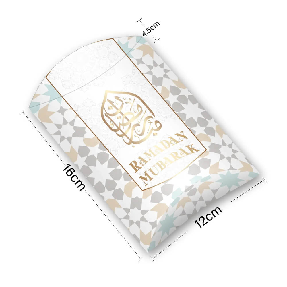 Package Includes: The package contains 12 Ramadan Mubarak Pillow Shaped Treat Boxes and the folded size is 11 cm x 16 cm x 4.3 cm, not too large nor too small, so it is very easy to carry. It will meet your needs perfectly.