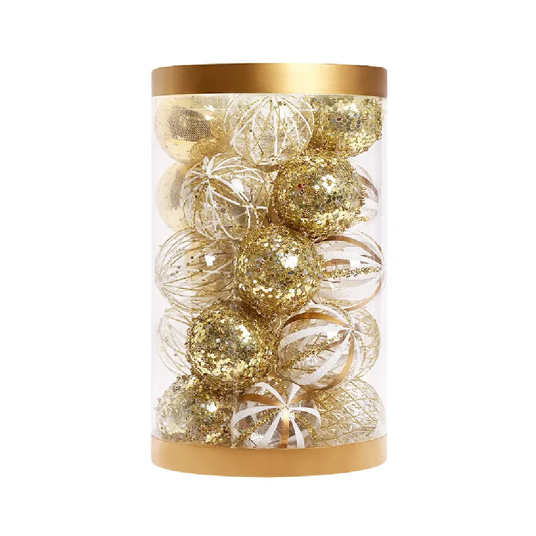 Shining Christmas Ball: Each barrel contains 25 pieces of Christmas tree decorations. These carved and painting Christmas balls feature coordinating colors with different finishes, such as glaze, matte, and glittering, to provide an exquisite look and set the stage for seasonal arrangements.