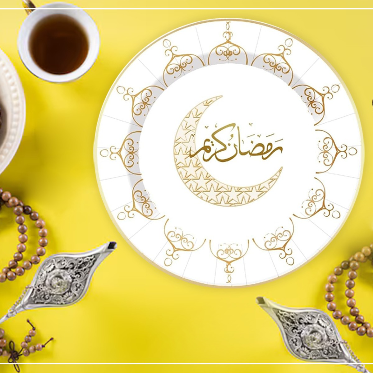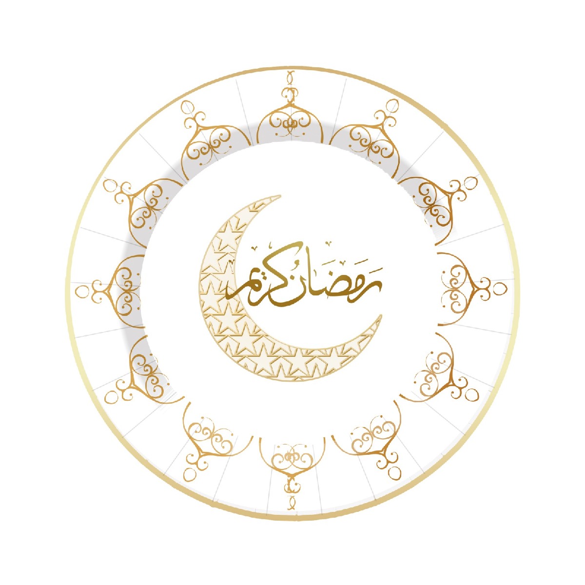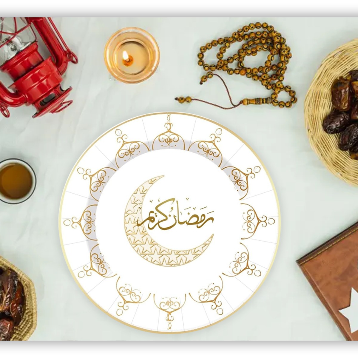 • Ramadan Kareem Design – Featuring a beautiful gold crescent moon and Arabic “Ramadan Kareem” calligraphy, these plates add a classy Islamic touch to your Ramadan and Eid table décor.