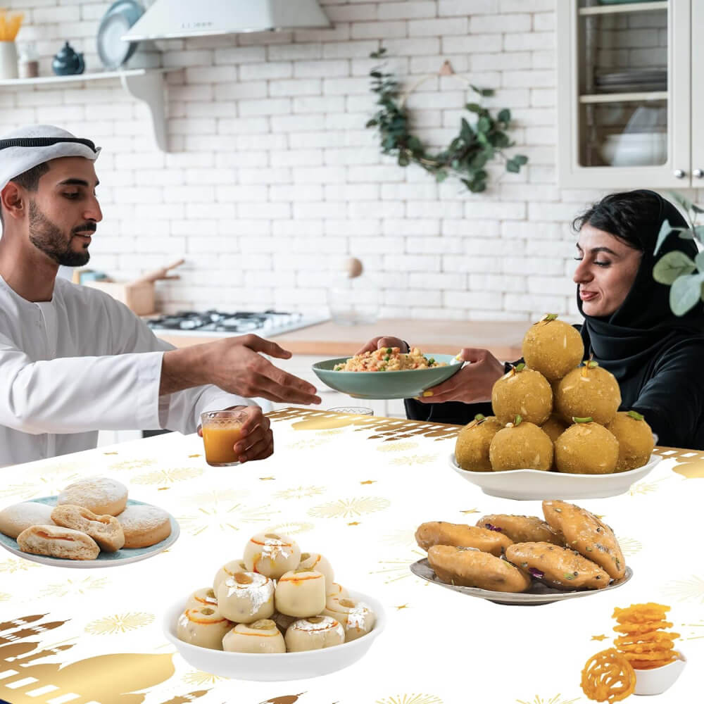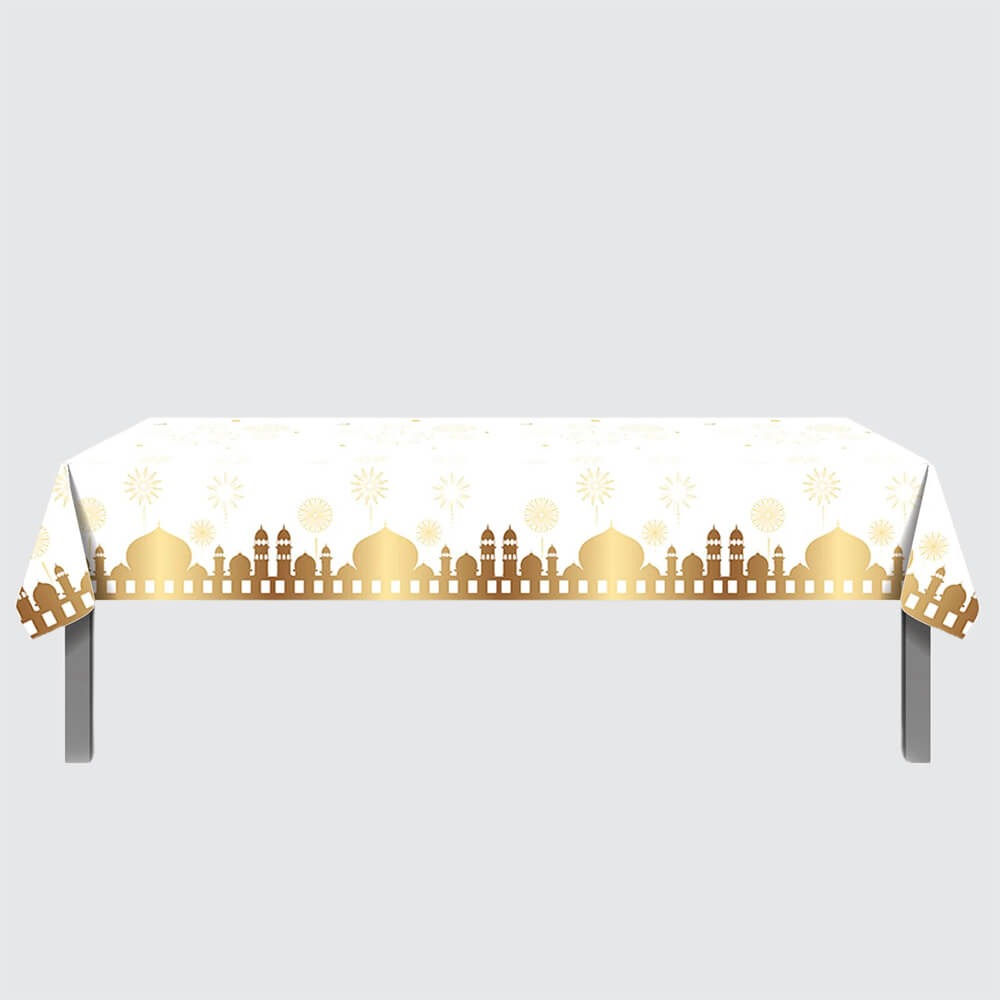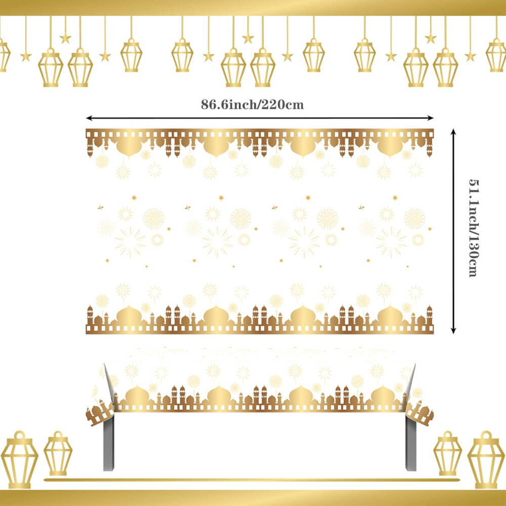 PERFECT SIZE: The White & Gold Eid Mubarak Tablecover Set comes with 1 piece per pack, which measures 130 x 220 cm/53 x 87 inches, large enough to cover any standard 8-foot rectangular table, suitable for Eid & Ramadan Mubarak table decoration. The White & Gold Eid & Ramadan Mubarak Tablecover Set can be easily folded into small tables; two or three can be put together to allow more people to come to the party.