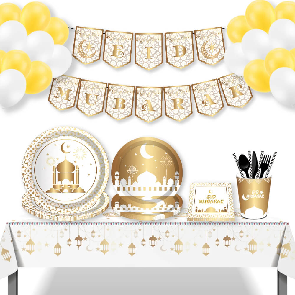 Create a stunning tablescape with our White & Gold Eid Mubarak Tablecover. The combination of white and gold brings a touch of glamour to your celebration. Durable and easy to clean, this set ensures your table is as festive as the occasion.
