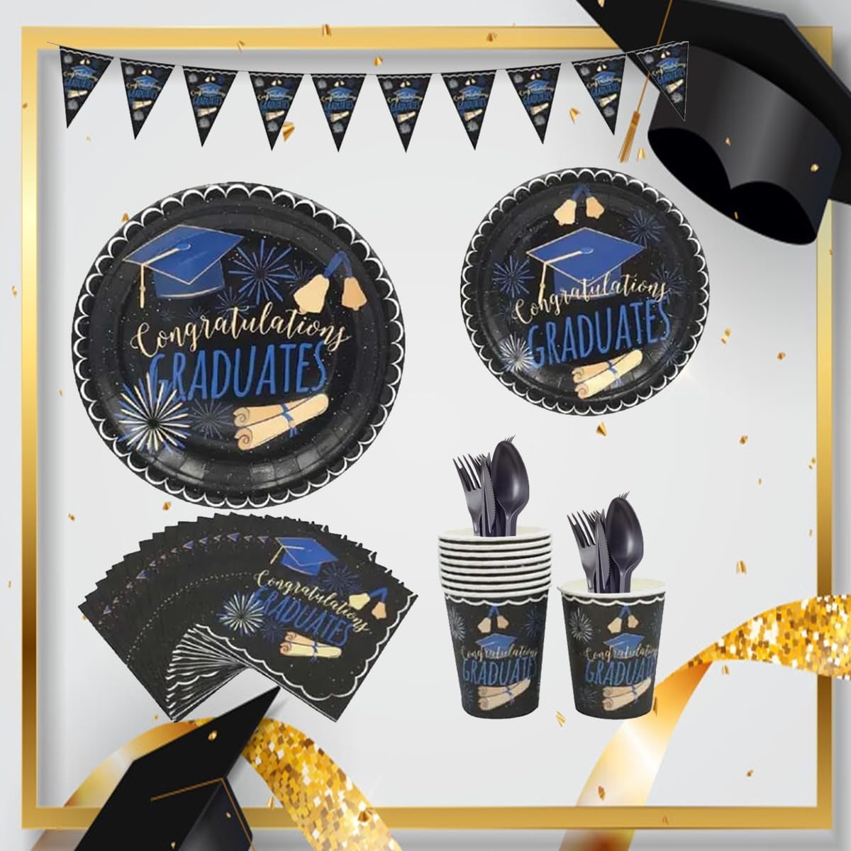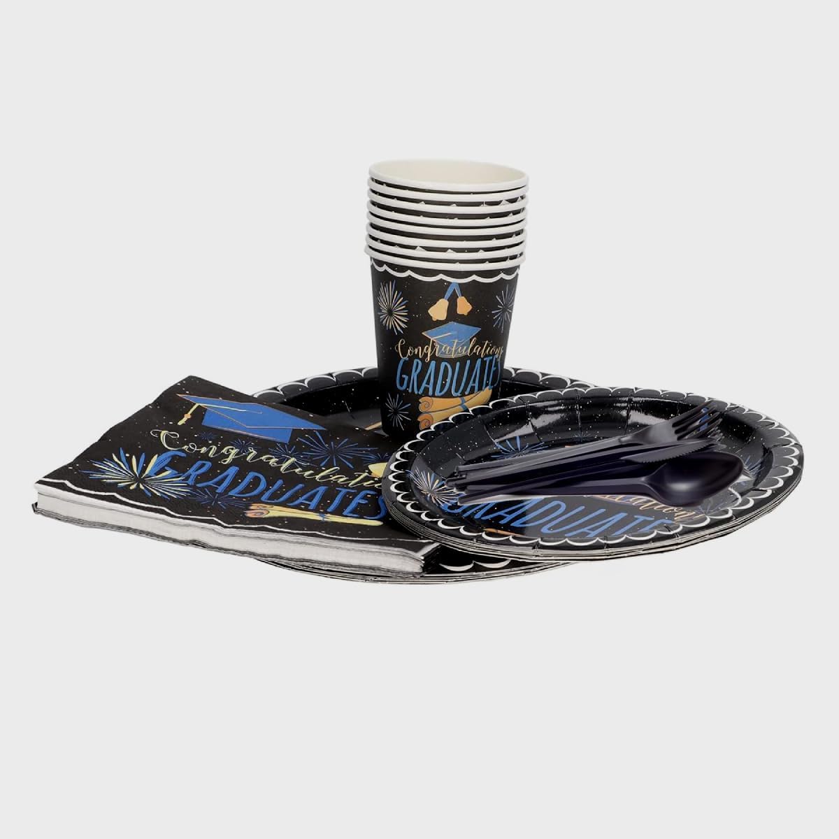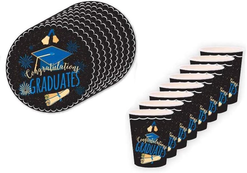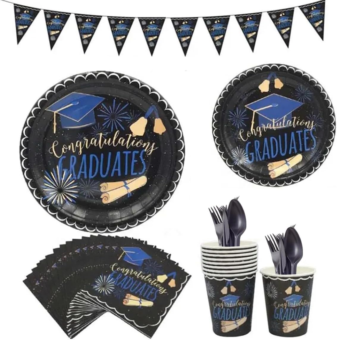 Make your graduation celebration unforgettable with this Pack of 65 Pcs Graduation Party Supplies Tableware Set, specially designed for graduation decorations 2025. This all-in-one graduation party supplies set includes everything you need to serve 8 guests in style—featuring 8 durable paper plates, 8 napkins, 8 cups, 8 plastic forks, 8 knives, and 8 spoons, along with a banner to complete your graduation party decorations.