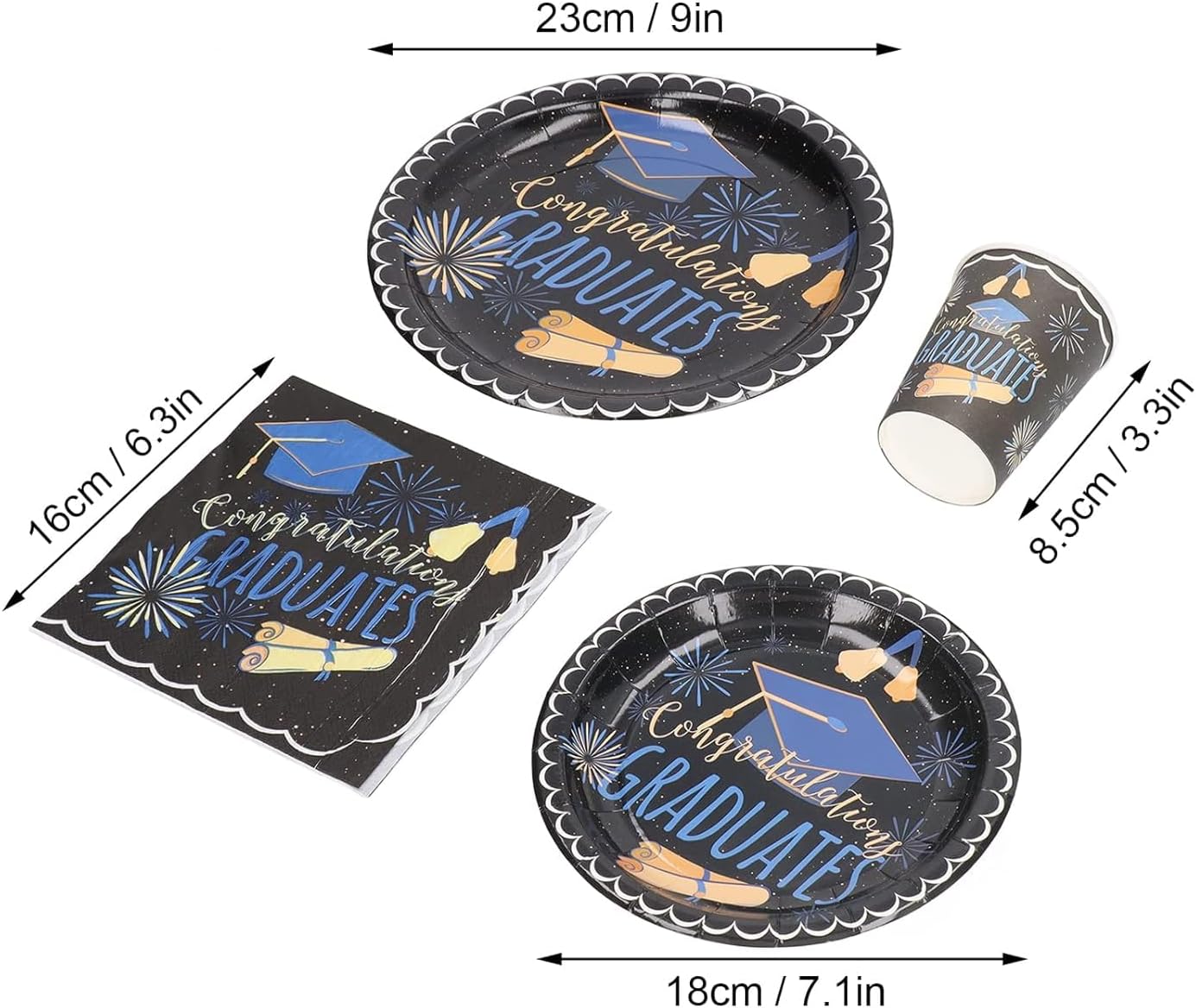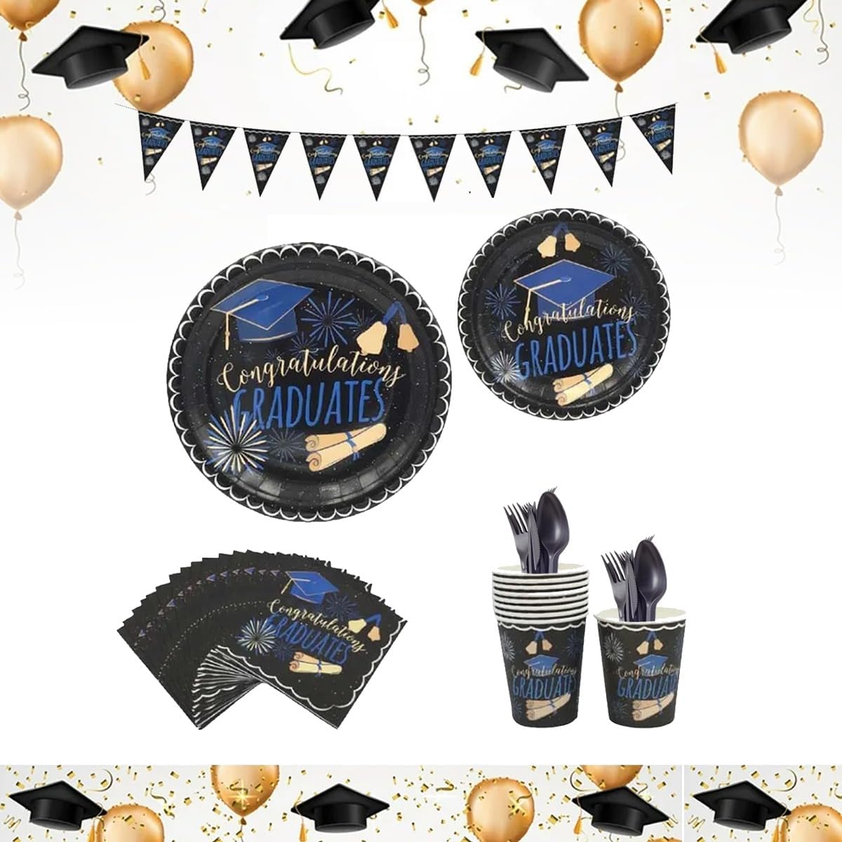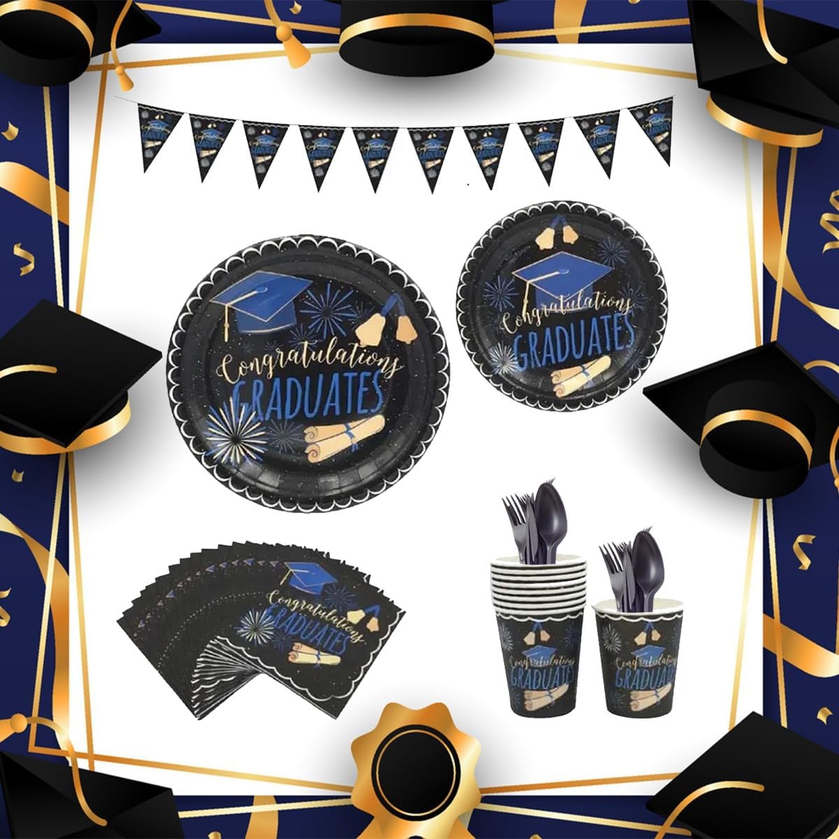 Make your graduation celebration unforgettable with this Pack of 65 Pcs Graduation Party Supplies Tableware Set, specially designed for graduation decorations 2025. This all-in-one graduation party supplies set includes everything you need to serve 8 guests in style—featuring 8 durable paper plates, 8 napkins, 8 cups, 8 plastic forks, 8 knives, and 8 spoons, along with a banner to complete your graduation party decorations.