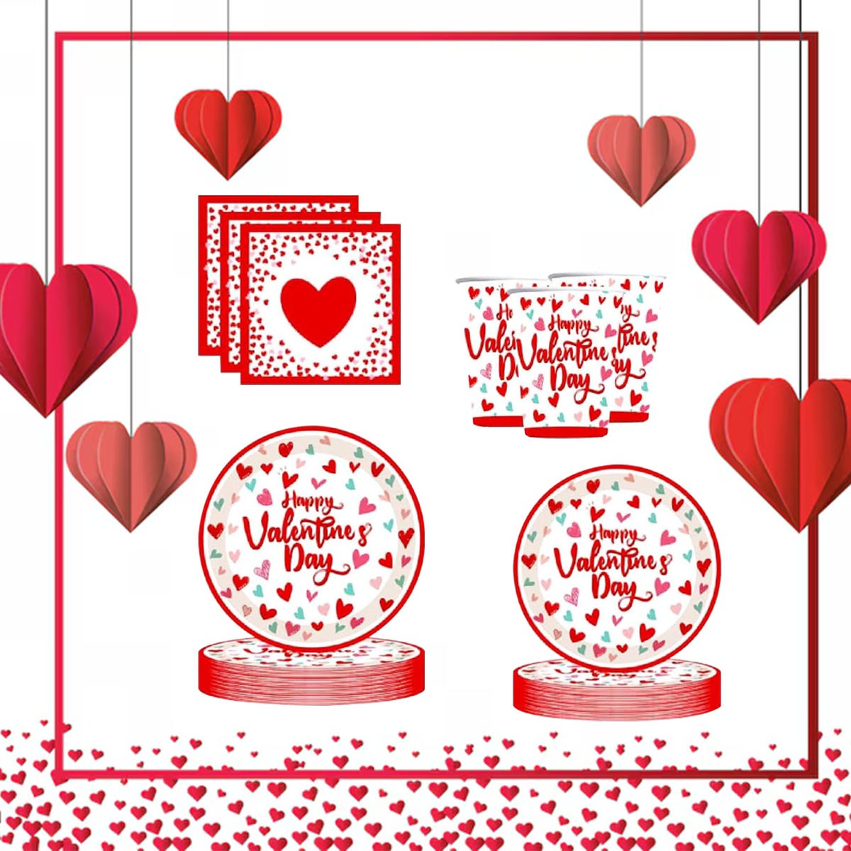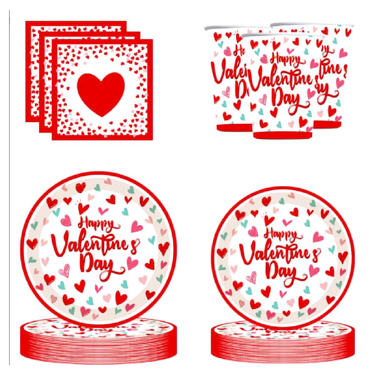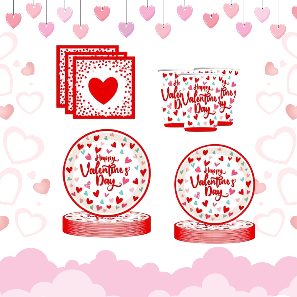 • Valentine Theme Design – Designed with charming heart patterns and “Happy Valentine’s Day” prints, this tableware set adds a romantic and festive touch to Valentine dinners, couple parties, proposals, anniversaries, and love-theme celebrations.